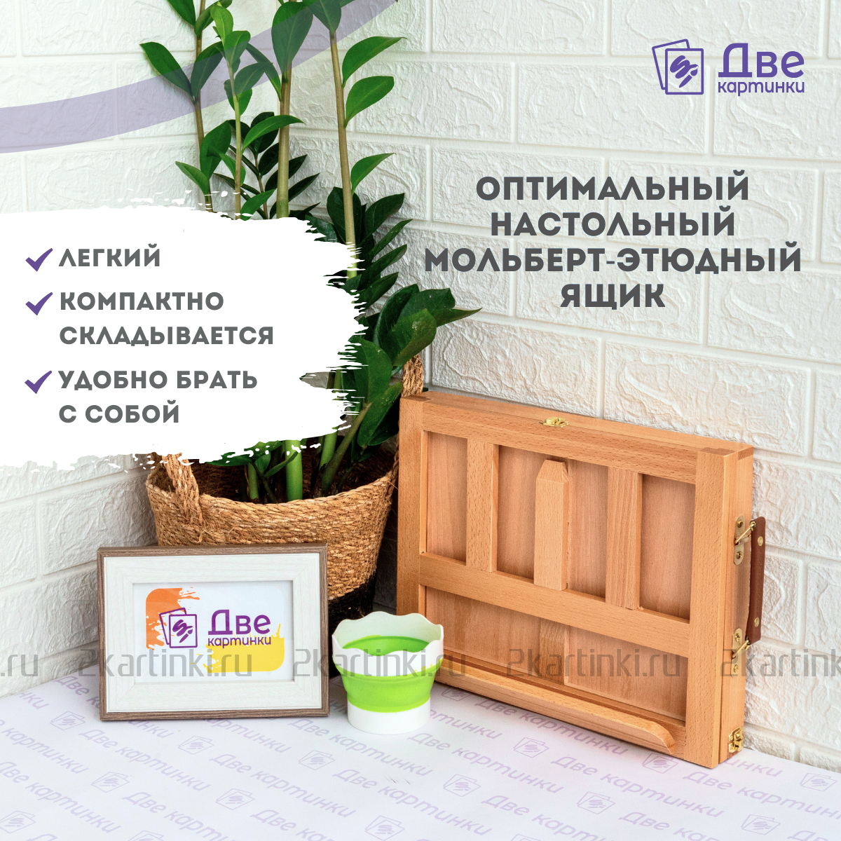 Выполнил из качественной древесины. Шлифовка идеальна. Удобный карман для красок и кистей, что даёт больше места на столе и сохранить порядок.
