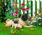 Алмазная вышивка «Щенок и мама мопсы на цветущей лужайке» 40x50 см